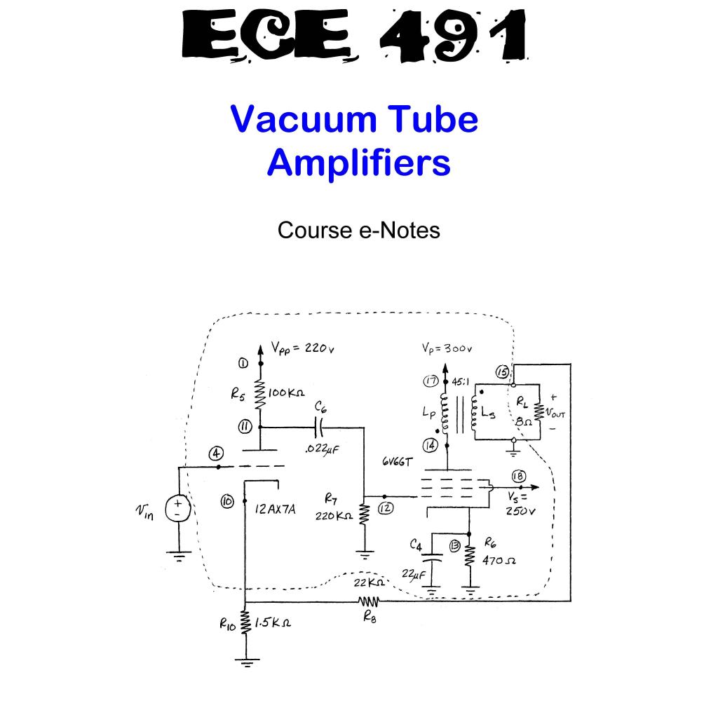 ECE 491: Special Topics: Vacuum Tube Amplifiers was a 1-credit course taught at Michigan State University for Electrical and Computer Engineering majors. The catalog description for this course is: Diodes. Triodes. Pentodes. Vacuum Tube Modeling. Amplifiers. The prerequisite for this course is ECE 302.